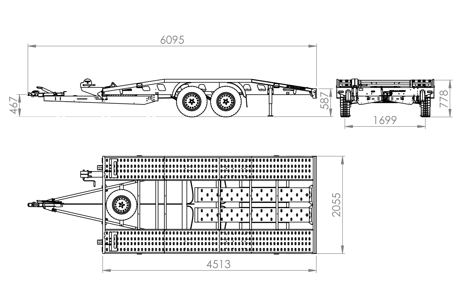 La rueda de apoyo facilita la maniobra del remolque de pie. La grúa también estaba equipada con una rueda de repuesto. Las dimensiones del muelle de carga de 4351 x 2157 mm y el peso bruto máximo del vehículo de 3000 kg permiten un transporte seguro del vehículo. Las fuertes pestañas de amarre garantizan la seguridad de los productos transportados. La resistencia del remolque está garantizada por el bastidor de carga fabricado en acero estructural con mayor resistencia.